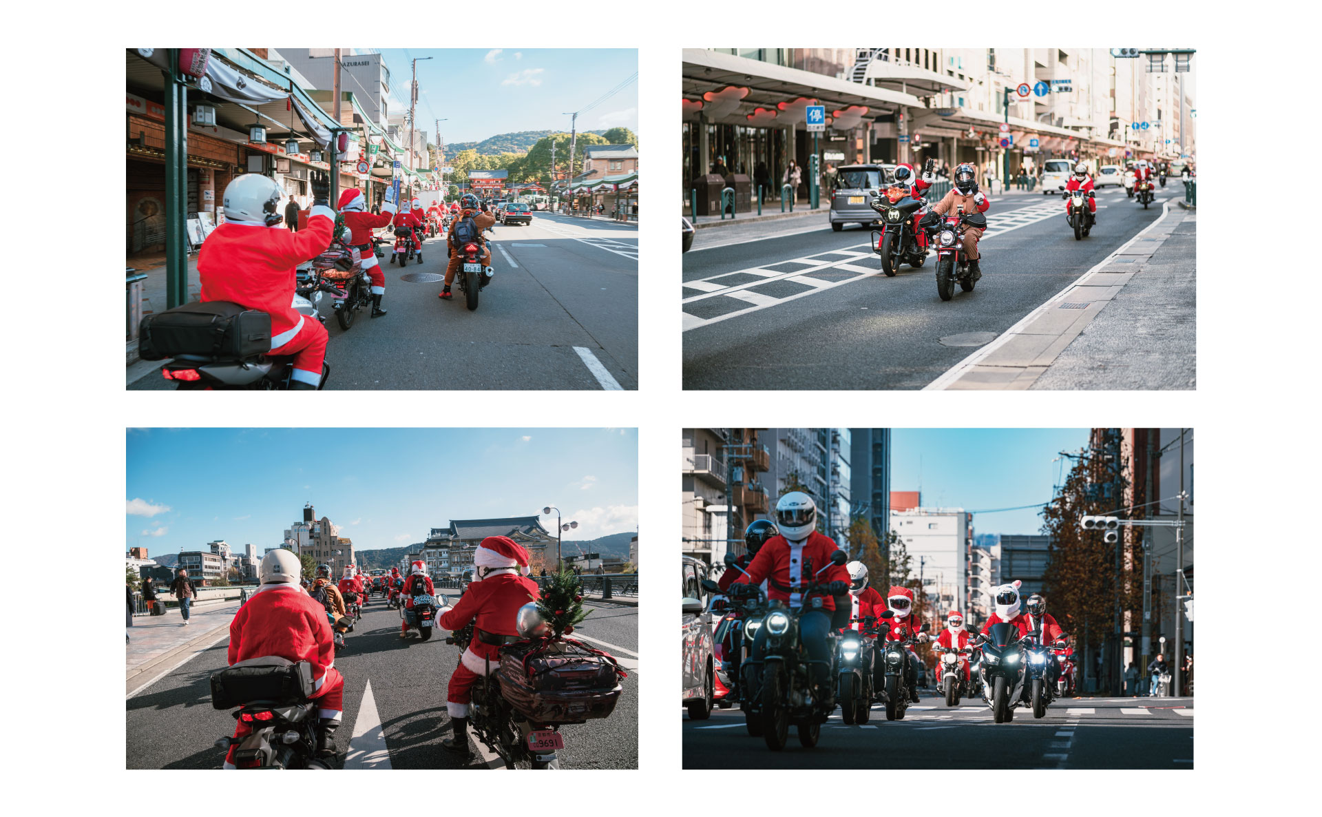 京都市内を舞台にしたこのツーリングは、サンタやトナカイのコスチュームでバイクに乗り、街を華やかに彩る特別な体験です。
