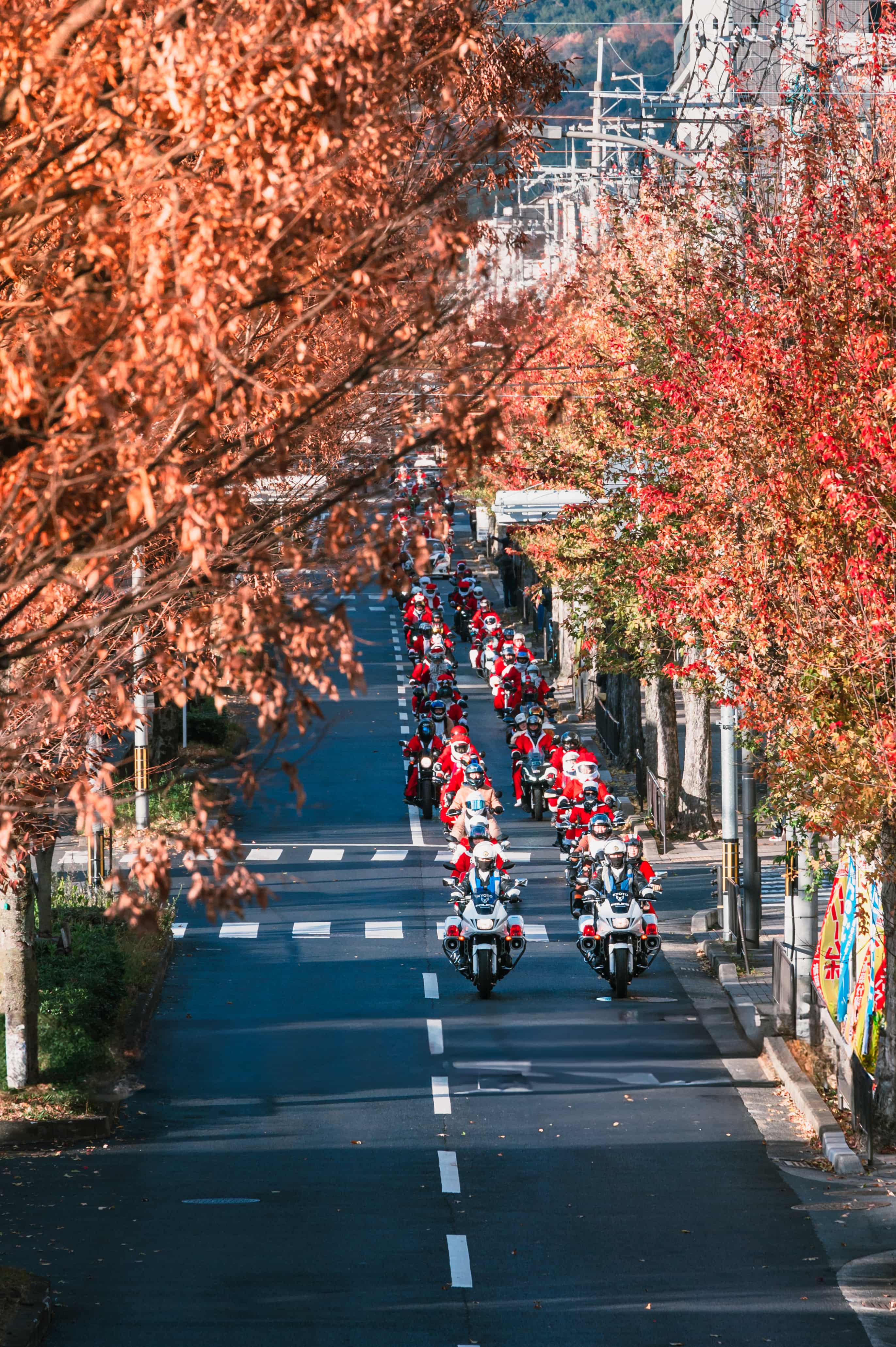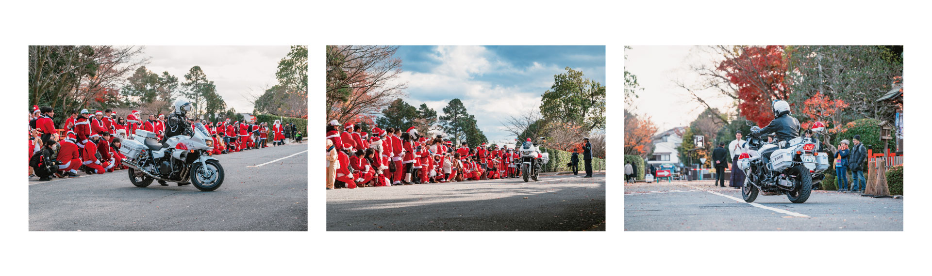 白バイ隊員が先導する交通パレードは、サンタツーリングのクライマックス。赤や白のコスチュームに身を包んだライダーたちが整然と列をなし、京都の街を颯爽と走り抜けます。サンタツーリングは見る人すべてに笑顔を届けます。白バイとの共演により交通マナーを意識しながら、安全で華やかな走行を楽しめるのもこのイベントならではの魅力です。