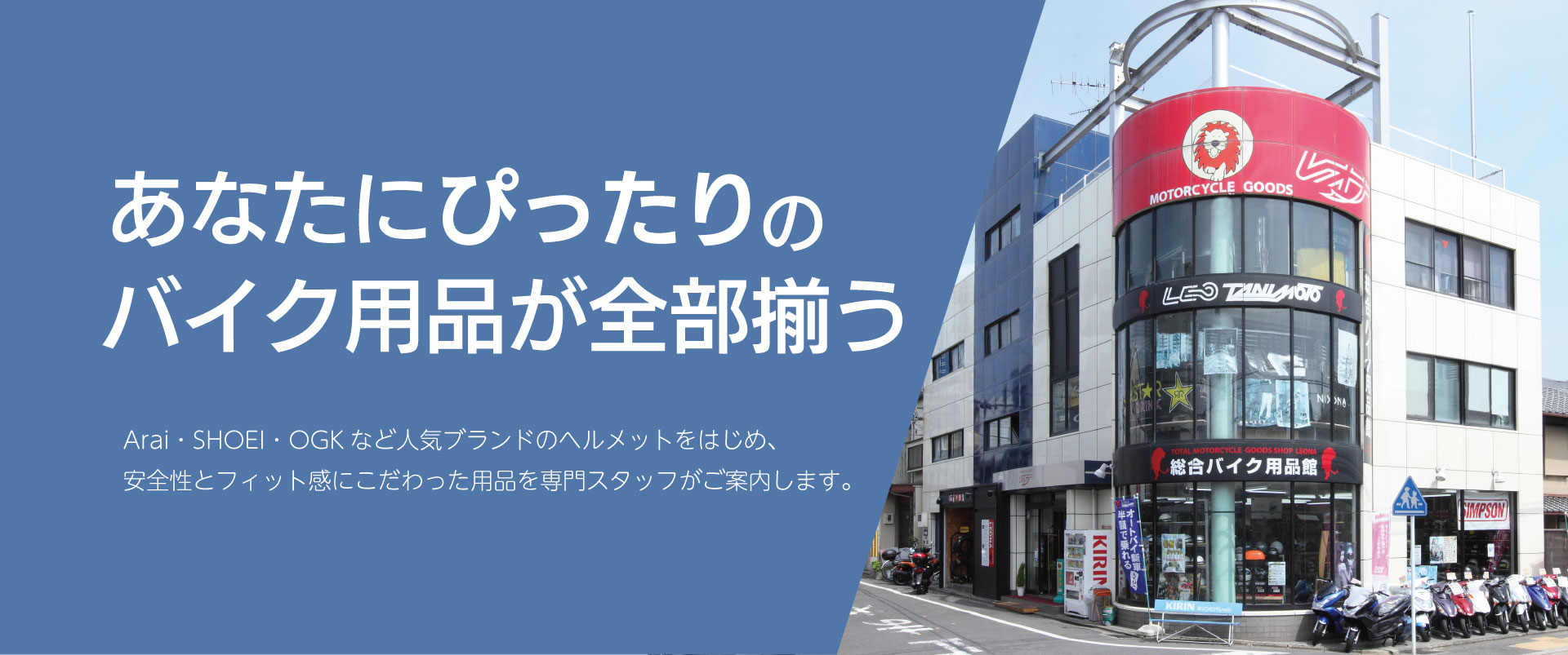 昨今、自宅に居ても様々な買物が可能になりました。もちろんバイク用品も同様です。 しかし、その購入方法で本当にあなたに合った最適の用品を手に入れる事が叶うのでしょうか。 用品専門店を本格運営してる当社だからこそ様々なご要望にお応えできる専門知識を持ったスタッフがサポートさせて頂きます。 あなたのバイクに対する悩みは用品館レオナに来ていただければ解決するかもしれません。是非、皆様のお越しを心よりお待ち申しております。 【レオタニモト店舗情報】 ●日本全国のライダーをサポートしたいという理念で、Web販売も行っており現在13周年を迎える楽天ショップを運営しています。